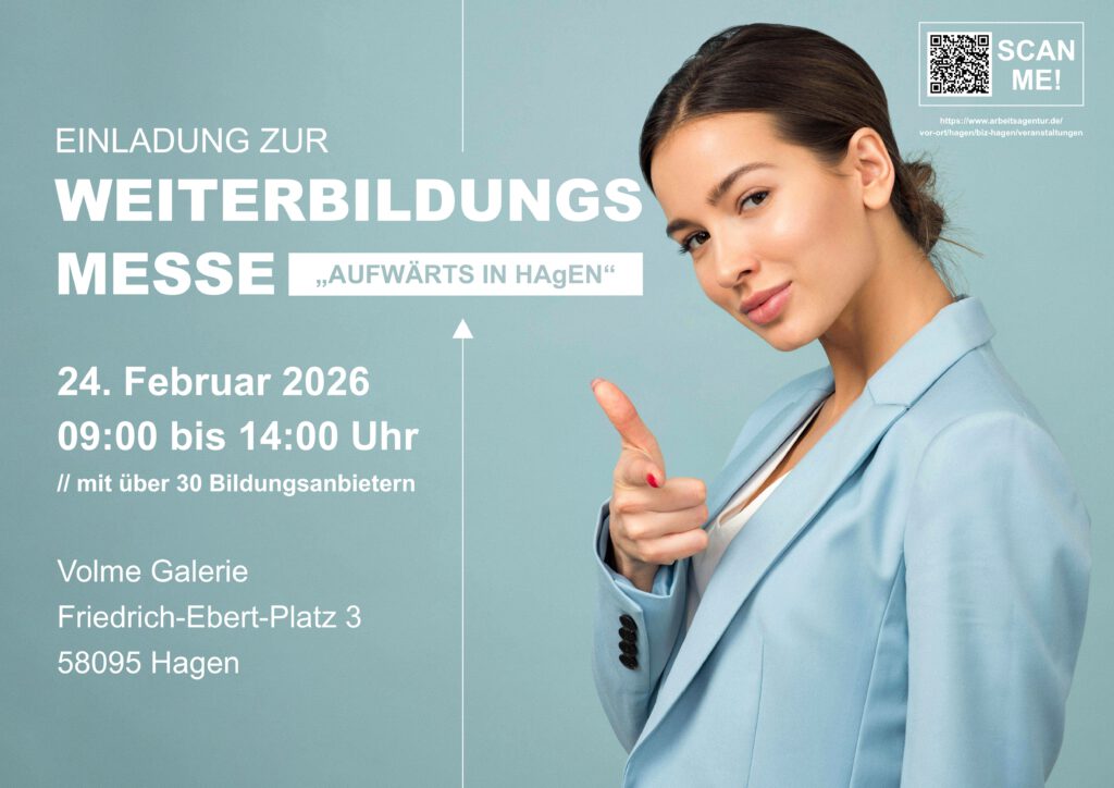 Bereit für den nächsten Schritt? Dann komm zur Weiterbildungsmesse „Aufwärts in Hagen“ am 24. Februar 2026 in die Volme Galerie. Über 30 Bildungsanbieter, persönliche Gespräche und neue Chancen – alles an einem Ort. 09:00–14:00 Uhr Volme Galerie Hagen Jetzt informieren. Zukunft gestalten. Veranstalter Jobcenter Hagen
